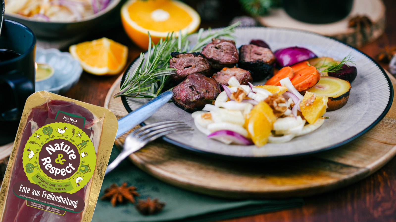 Winter barbecue skewers with duck breast fillet, vegetables and orange and fennel salad